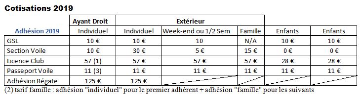 Tableau des cotisations section voile et GSL 2019